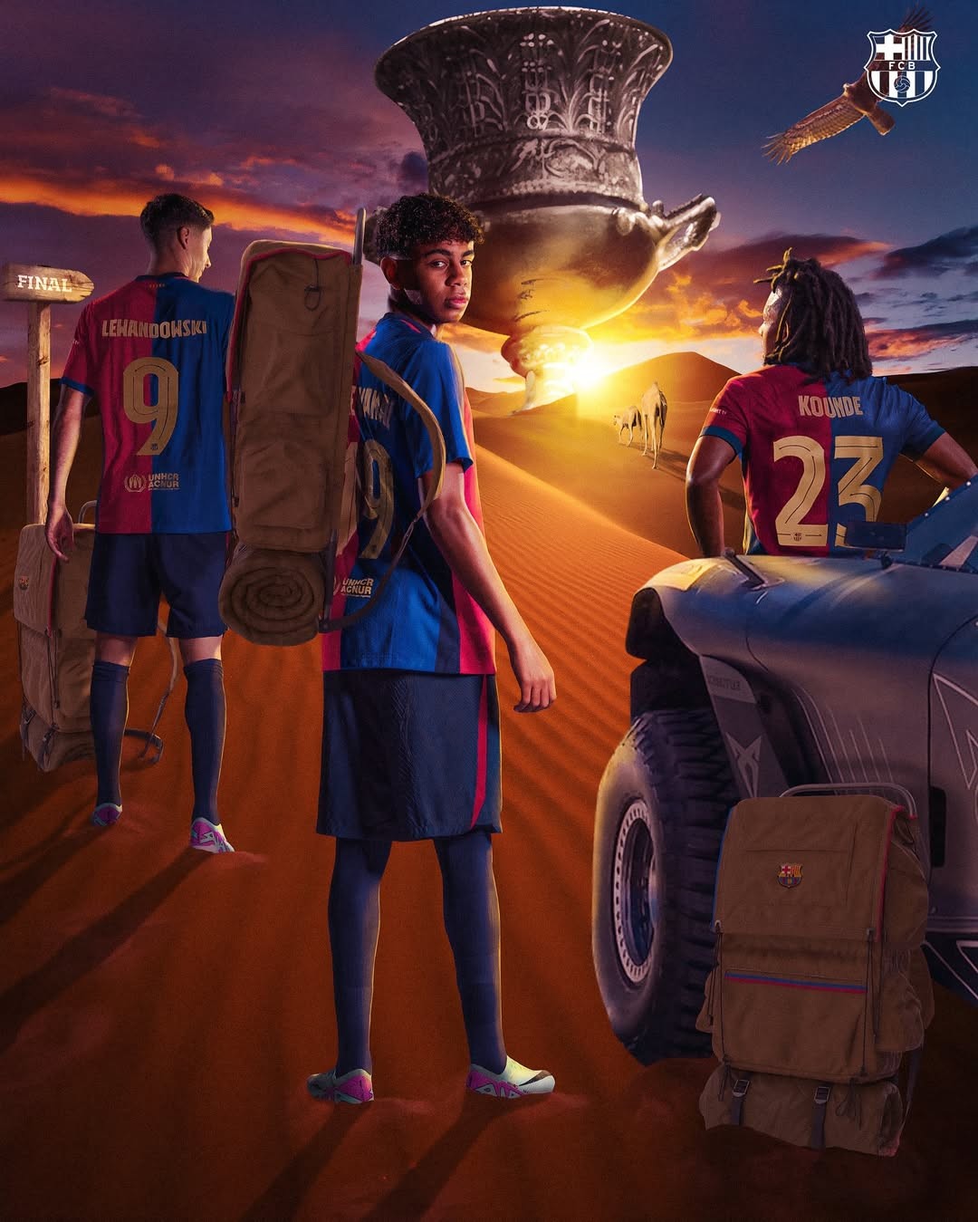 赛前一天,巴萨官方发布了预热海报,海报以沙漠为背景,黄昏的阳光洒在沙丘上,远处是一座巨大的西超杯冠军奖杯。